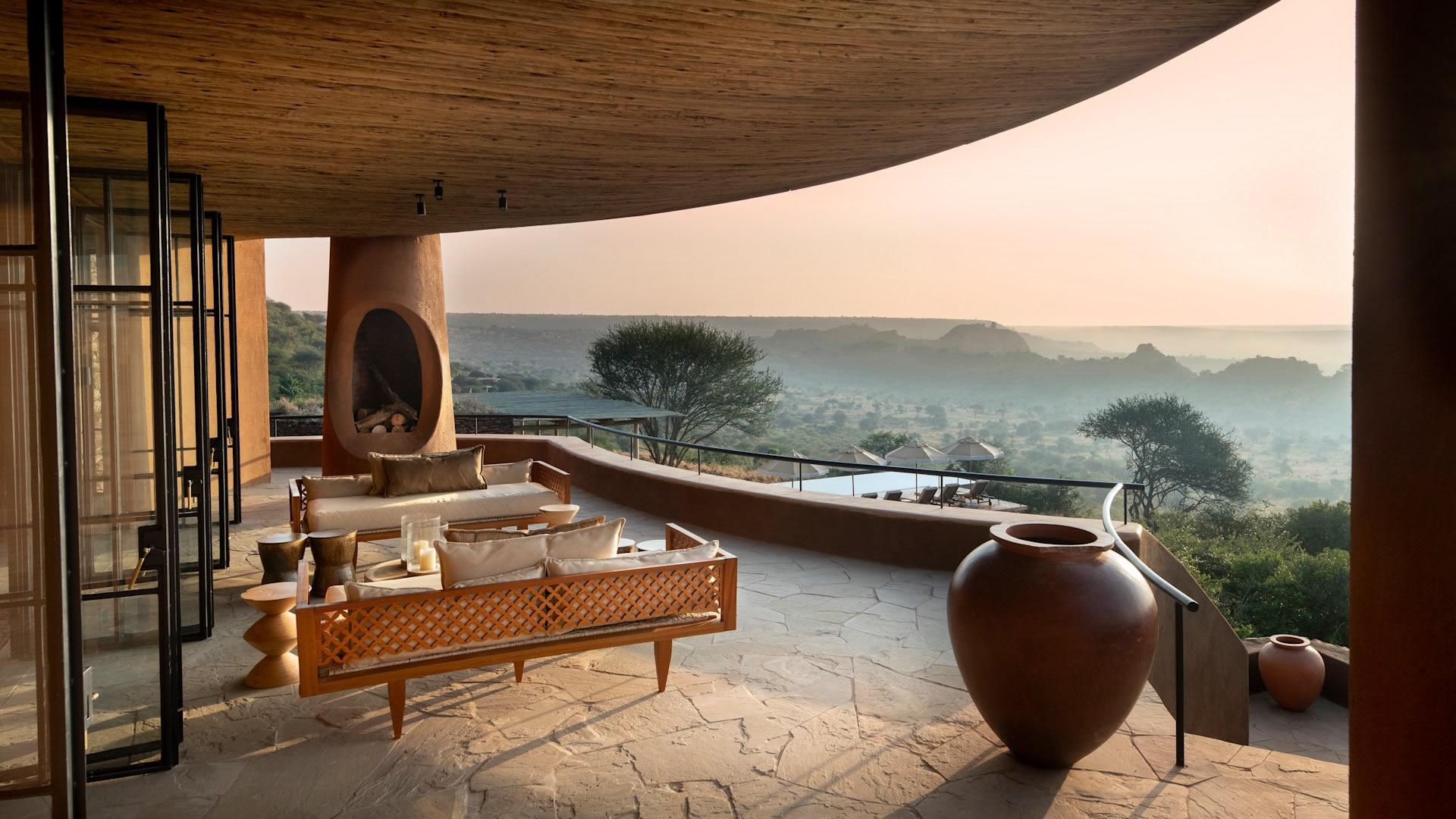 Fourteen suites along the escarpment edge, each a domed structure of volcanic rock clad in the reddish-brown soil of the site itself. The architecture, a collaboration between Nicholas Plewman Architects, Michaelis Boyd, and Fox Browne Creative, takes its cues from the kopjes opposite: curved forms, turf rooftops returning to grassland, a colour palette drawn from the mottled coat of the African wild dog. The design philosophy has a name, Afro Wabi-Sabi, though the building explains it better than the label does. What the three firms have produced is a lodge that looks as though it grew from the escarpment rather than was placed upon it.
